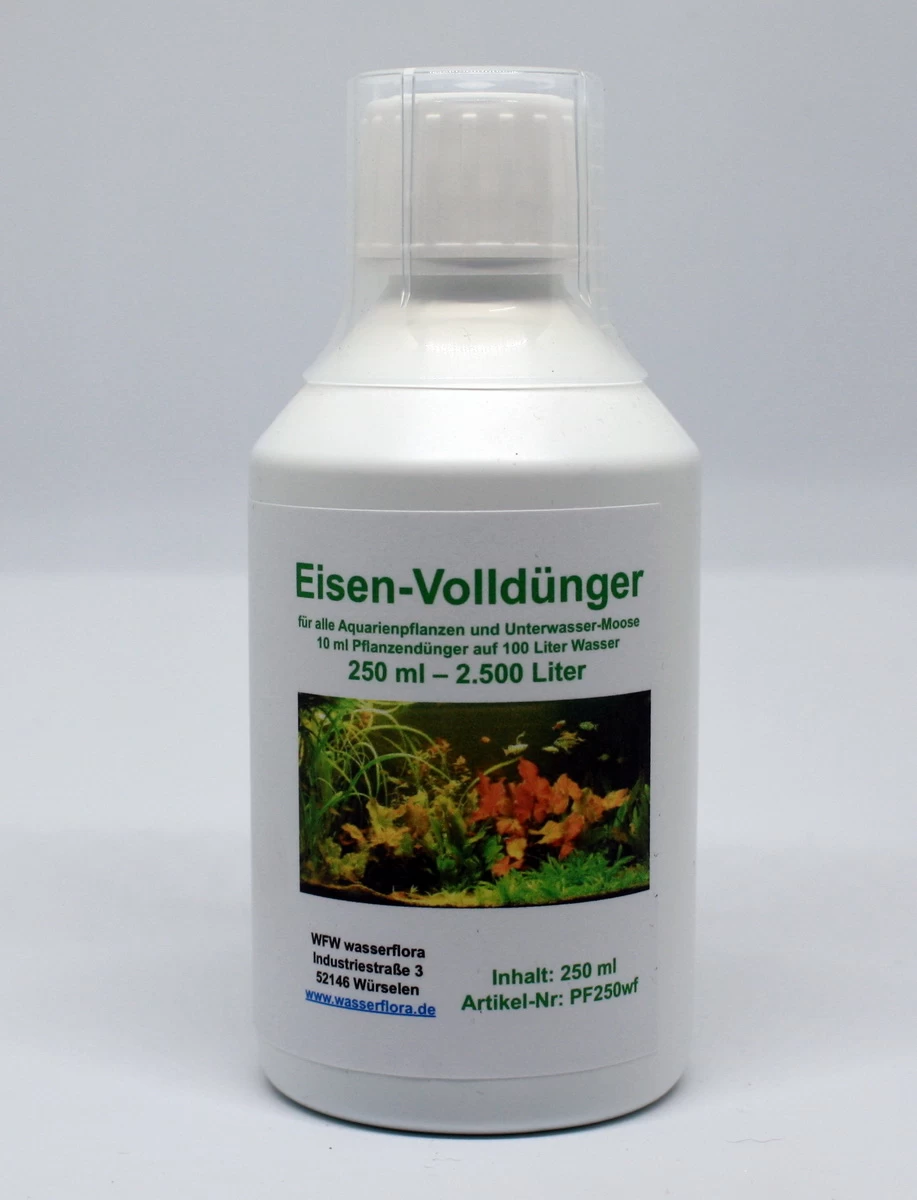 Der ideale flüssige Eisen-Volldünger für alle Aquarienpflanzen und Unterwasser-Moose – sorgt für ein üppiges und optimales Pflanzenwachstum. Die Blätter der Pflanzen werden nicht gelb und bekommen keine Löcher. Alle notwendigen Spurenelemente und Mineralien sind in dem Wasserpflanzendünger im richtigen Verhältnis enthalten. Aufgrund der besonderen zugesetzten Wirkstoffe wird der Algenwuchs eingedämmt und sorgt somit für sattgrüne und kräftige Pflanzen. Der Dünger ist unbedenklich für Garnelen und andere Wirbellose.