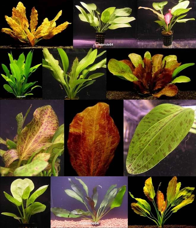 Echinodorus amazonicus, Echinodorus argentinensis / Argentinischer Froschlöffel,Echinodorus bleheri,Echinodorus bolivianus,Echinodorus cordifolius / Großer Froschlöffel, Echinodorus Foxtail, Echinodorus Gabrielli, Echinodorus Golden Flame, Echinodorus Green Flame / Grüngeflammte Schwertpflanze, Echinodorus harbich grün / Kleiner Froschlöffel harbig, Echinodorus harbich rot / Rötlicher Froschlöffel harbig, Echinodorus horemanii, Echinodorus horemanii rot, Echinodorus Ipica, Echinodorus Jaguar, Echinodorus Lothario, Echinodorus Major Martii / Gewelltblättrige Schwertpflanze, Echinodorus Marble Queen, Echinodorus Muricatus, Echinodorus Oriental, Echinodorus osiris rubra, Echinodorus ozelot grün / Gefleckte grüne Schwertpflanze, Echinodorus ozelot rot / Gefleckte rote Schwertpflanze, Echinodorus Paniculatus, Echinodorus parv. Tropica, Echinodorus parviflorus, Echinodorus Radican, Echinodorus Rainers Kitty, Echinodorus Red Flame, Echinodorus Rigidifolius, Echinodorus Rose, Echinodorus Rubra, Echinodorus Rubra Lucanas, Echinodorus schlueteri / Schlüters Schwertpflanze, Echinodorus Spidernet, Echinodorus Subulatus Lucanas, Echinodorus tricolor, Echinodorus Uruguayensis, Echinodorus x barthii, … viele weitere Sorten!
