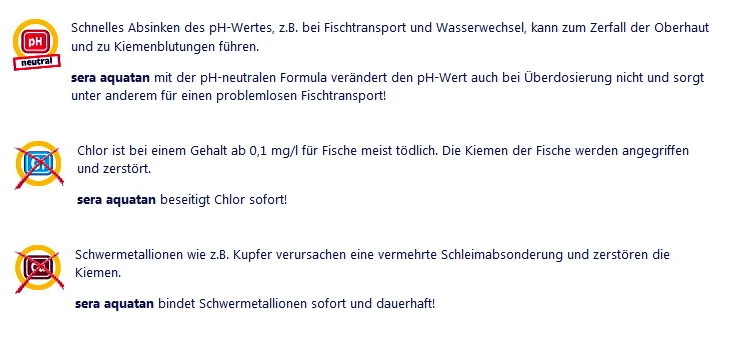 Ein schnelles Absinken des pH-Wertes, z.B. bei Fischtransport und Wasserwechsel, kann zum Zerfall der Oberhaut und zu Kiemenblutungen führen. sera aquatan mit der pH-neutralen Formula verändert den pH-Wert auch bei Überdosierung nicht und sorgt unter anderem für einen problemlosen Fischtransport!