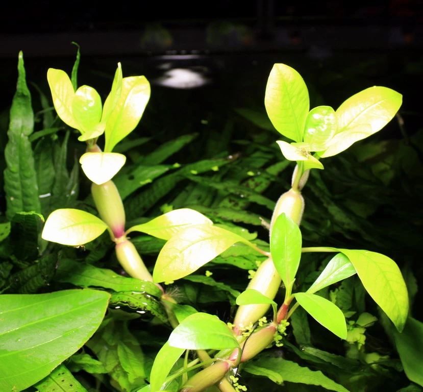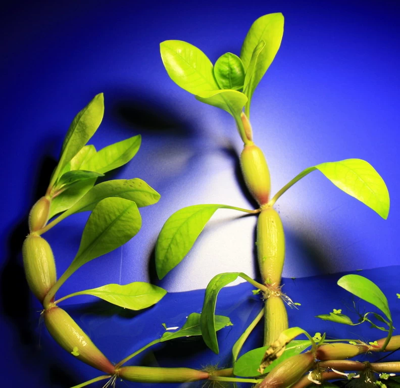 Das kleine schwimmende Papageienblatt ist eine faszinierende und außergewöhnliche Schwimmpflanze. In freier Natur versucht sie ihre Wurzeln im nährstoffreichen Boden zu verankern. Ihre langen Triebe wachsen über die Wasseroberfläche und bilden dabei einen geschützten Lebensraum für andere Schwimmpflanzen wie Wasserhyazinthe, Froschbiss, Schwimmende Wolfsmilch und andere Arten. Die hohlen Triebe dieser Stängelpflanze die mit Luft gefüllt sind – ermöglichen ihr das Schwimmen. An den Knoten bilden sich die lanzenartigen Blätter und Wurzeln. Die kleinen weißen Blütenknäule ruhen auf rötlichen Stielen in den Achseln der Blätter. Diese kleine Variante der Alternanthera aquatica kann im Aquarium und im Sommer auch auf dem Gartenteich kultiviert werden. Eine kräftige Düngung und eine intensive Beleuchtung sind wichtigste Faktoren für einen Langzeiterfolg. Ein regelmäßiger Rückschnitt der Triebe ist dabei unerlässlich. Die abgetrennten Kopfstecklinge können wieder eingesetzt werden oder einfach im Aquarium schwimmen – sie bilden zügig neue Wurzeln.