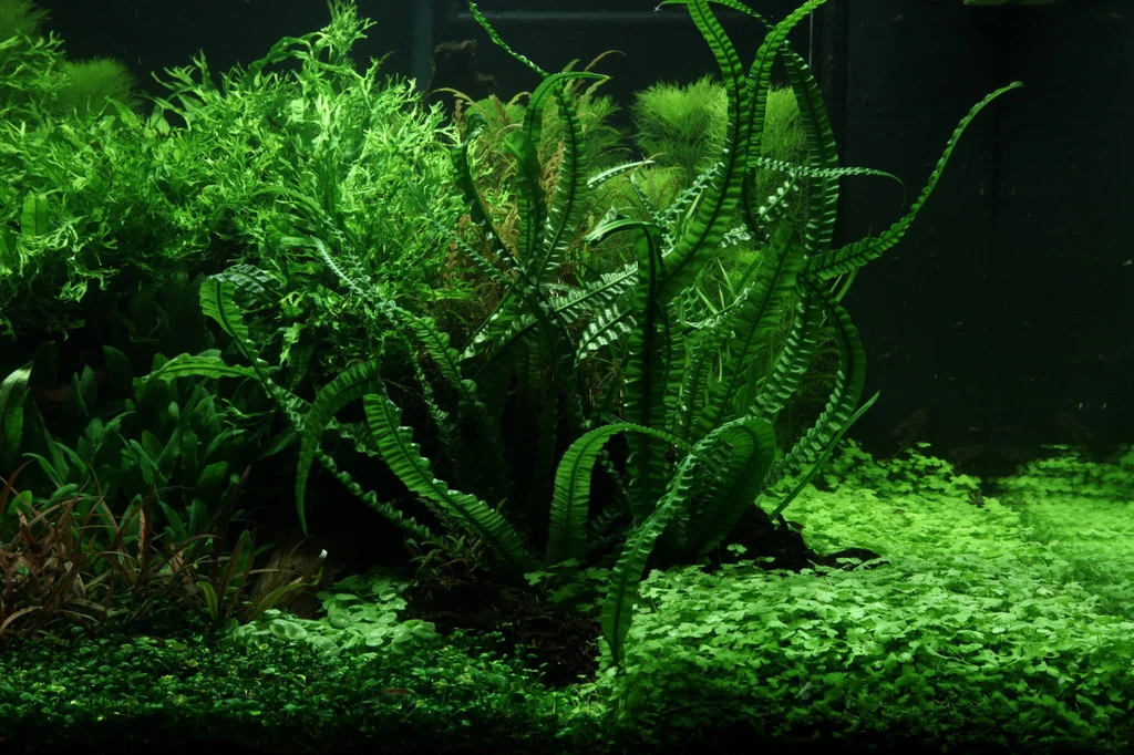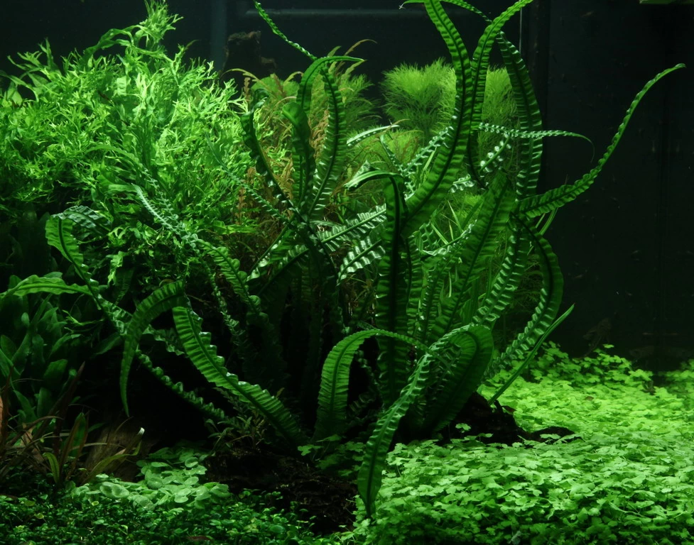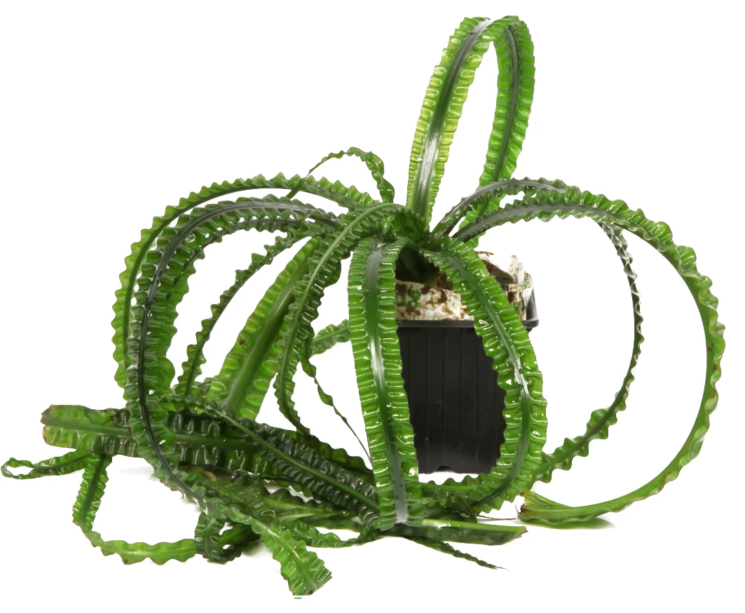 Crinum natans ist ein sehr attraktives und graziles Zwiebelgewächs. Die etwas steife Hakenlilie hat stark gewellte bis gekräuselte, breite Blätter. Beim Einpflanzen müssen 2/3 der Zwiebel sichtbar bleiben. Im Aquarium bilden ältere, gut gewachsene Pflanzen oft Seitenzwiebeln und können einen langen Blütenstengel mit einer hübschen, duftenden Lilienblüte über der Wasseroberfläche entwickeln. Die Blattbreite und Welligkeit des Blattrandes sind sehr variabel. Eignet sich für Zimmerteiche und wird nicht von pflanzenfressenden Fischen gefressen.