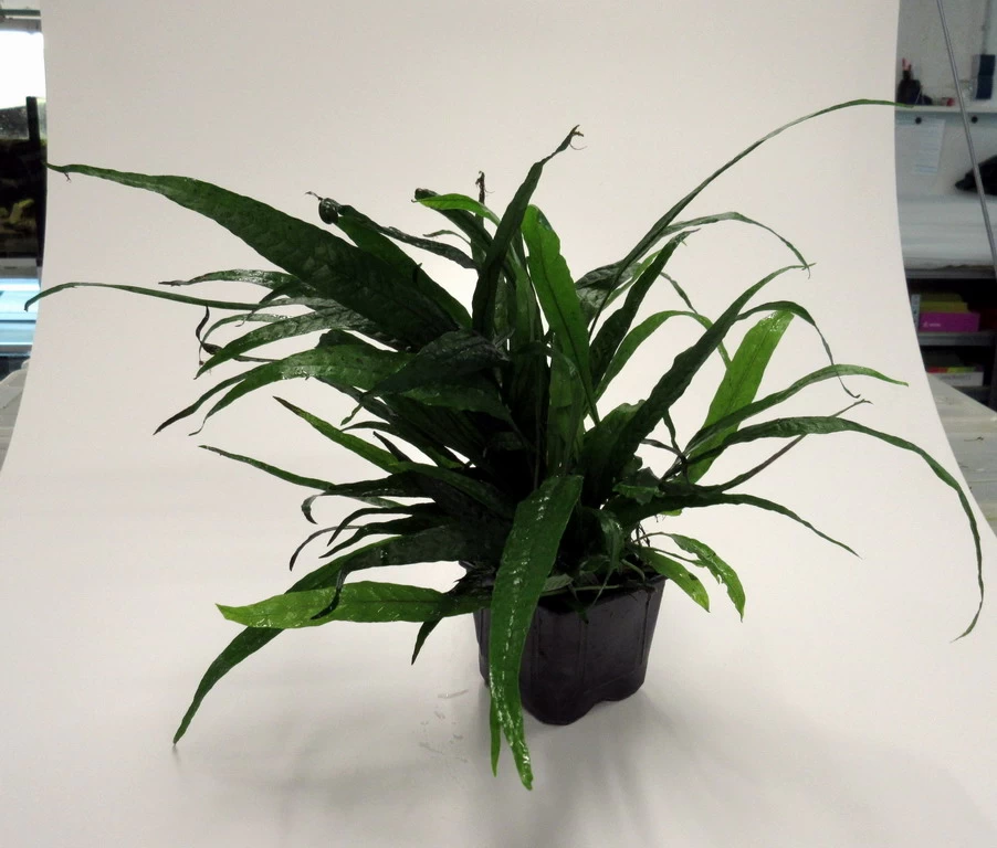 Microsorum pteropus ist ein sehr variable Art mit reichen Möglichkeiten für die Anzucht unterschiedlicher Varianten. Microsorum pteropus ‚Narrow‘ hat feine und schmalere Blätter, die mehr rechtwinklig aus der Pflanze wachsen als bei dem altbekannten Microsorum pteropus. Eine attraktive Pflanze, die sich gut für kleinere Aquarien eignet. Es ist ein sehr anspruchloses Wasserfarn, das mit wenig Licht sehr gut zurecht kommt und auf einer Wurzel oder einem Stein wachsen sollte. Bis es angewachsen ist sollte es mit einer Nylonschnurfixiert werden. Falls es in den Bodengrund gepflanzt wird, darf der Wurzelstock nicht bedeckt werden, da er sonst fault. Es lässt sich leicht durch Teilung des waagerechten Wurzelstocks (Rhizom) vermehren. Eine anspruchslose Pflanze, die unter allen Bedingungen wächst. Die schwarzen Flecken, die sich auf der Unterseite der Blätter bilden, sind Sporenbehälter (Vermehrungsorgane) und nicht wie manchmal vermutet eine Erkrankung. Adaptiv-Pflanzen bilden sich bei guter Pflege von selber an den Blattspitzen. Schöne Pflanze für den Mittelgrund im Nano Cube mit Garnelen – als auch für das Barschbecken Malawi-/ Tanganjikasee. Siehe auch Microsorum pteropus und Microsorum pteropus Windelov.