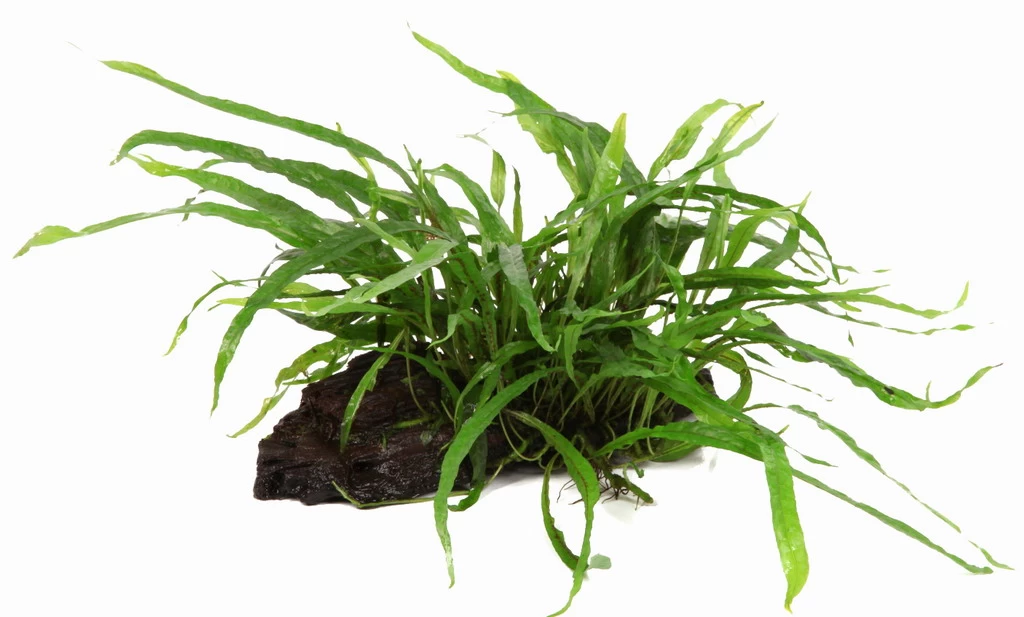 Microsorum pteropus ist ein sehr variable Art mit reichen Möglichkeiten für die Anzucht unterschiedlicher Varianten. Microsorum pteropus ‚Narrow‘ hat feine und schmalere Blätter, die mehr rechtwinklig aus der Pflanze wachsen als bei dem altbekannten Microsorum pteropus. Eine attraktive Pflanze, die sich gut für kleinere Aquarien eignet. Es ist ein sehr anspruchloses Wasserfarn, das mit wenig Licht sehr gut zurecht kommt und auf einer Wurzel oder einem Stein wachsen sollte. Bis es angewachsen ist sollte es mit einer Nylonschnurfixiert werden. Falls es in den Bodengrund gepflanzt wird, darf der Wurzelstock nicht bedeckt werden, da er sonst fault. Es lässt sich leicht durch Teilung des waagerechten Wurzelstocks (Rhizom) vermehren. Eine anspruchslose Pflanze, die unter allen Bedingungen wächst. Die schwarzen Flecken, die sich auf der Unterseite der Blätter bilden, sind Sporenbehälter (Vermehrungsorgane) und nicht wie manchmal vermutet eine Erkrankung. Adaptiv-Pflanzen bilden sich bei guter Pflege von selber an den Blattspitzen. Schöne Pflanze für den Mittelgrund im Nano Cube mit Garnelen – als auch für das Barschbecken Malawi-/ Tanganjikasee. Siehe auch Microsorum pteropus und Microsorum pteropus Windelov.