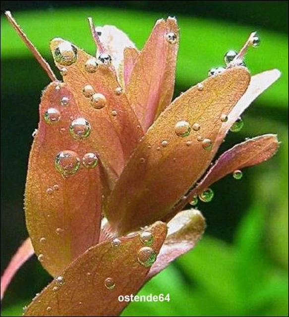 Rotala rotundifolia – der lateinische Name bedeutet ‚rundblättrige Pflanze‘. Doch das trifft nur auf die Sumpfform zu, die kreisrunde Blätter hat. Im Aquarium bildet Rotala rotundifolia längliche, dünne Blätter. Die Blättchen stehen meist paarig, kreuzweise übereinander, Triebspitzen gelblich bis rötlich. Im Gegensatz zu anderen Rotala-Arten ist sie relativ anspruchslos, obwohl sie viel Licht benötigt um rote Blätter zu bilden. Je mehr Licht, um so intensiver die rote Farbe. Sie entwickelt sehr bereitwillig Seitentriebe und somit eine dichte, buschige Form. Dadurch gelangt das Licht nur schwer zu den unteren Blättern und die Pflanze muss häufig beschnitten werden. Eine Vermehrung erfolgt duch Seitentriebe oder 15 cm lange Kopfstecklinge. Wird auch unter dem Namen Rotala indica gehandelt.